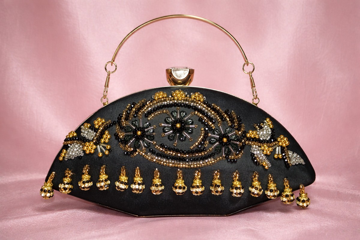 Type of work : This black gold bridal clutch is carefully hand embellished using beads, crystals, and intricate detailing, all stitched one by one to create a delicate and refined design. Decorative bead hangings are thoughtfully attached by hand, adding graceful movement and dimension. Each element is placed with precision to highlight the fine craftsmanship, balanced composition, and elegant finishing of the piece.