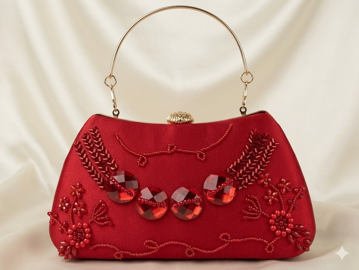 Type of work : This red fancy clutch for women is hand embellished / hand-embroidered with high-quality crystals, sequins, and beads.