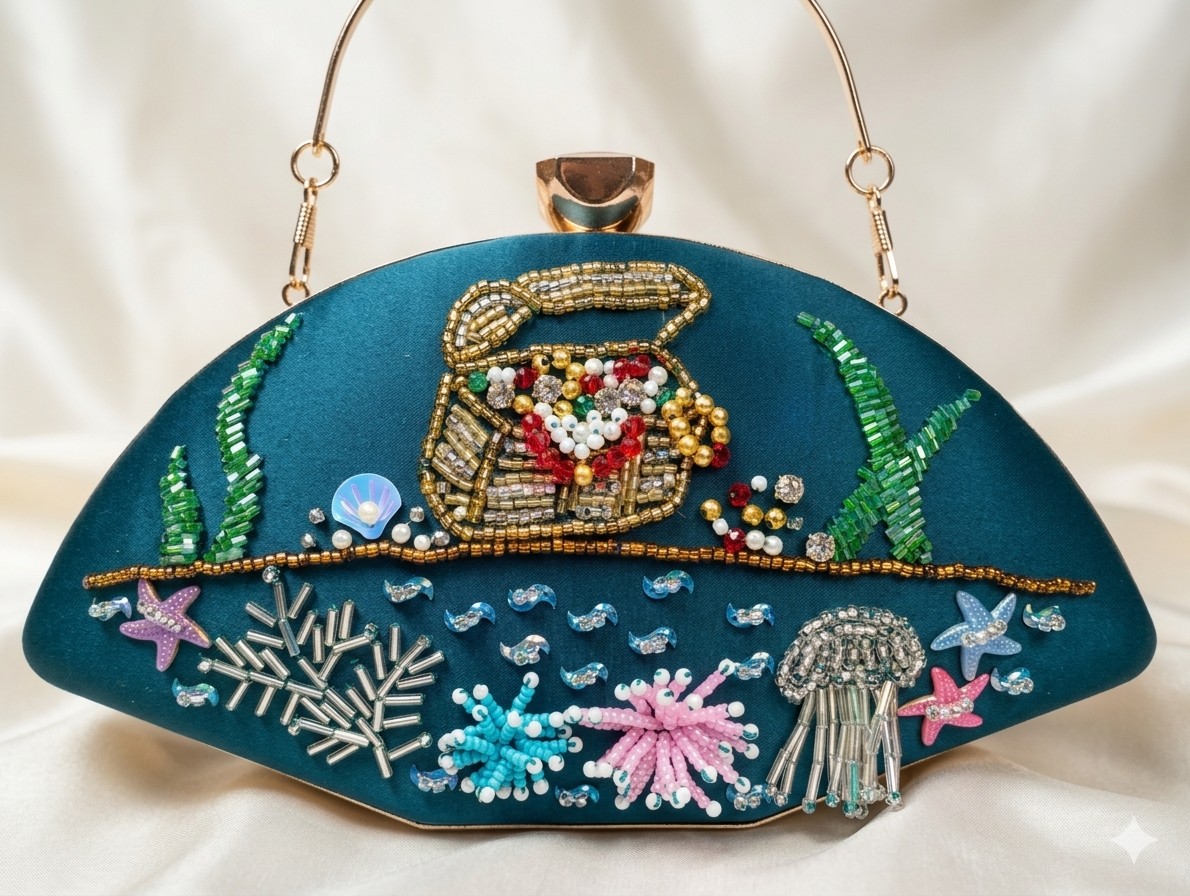 Type of work : This teal fancy clutch for women is hand embellished / hand-embroidered with high-quality beads, rhinestones, and crystals.