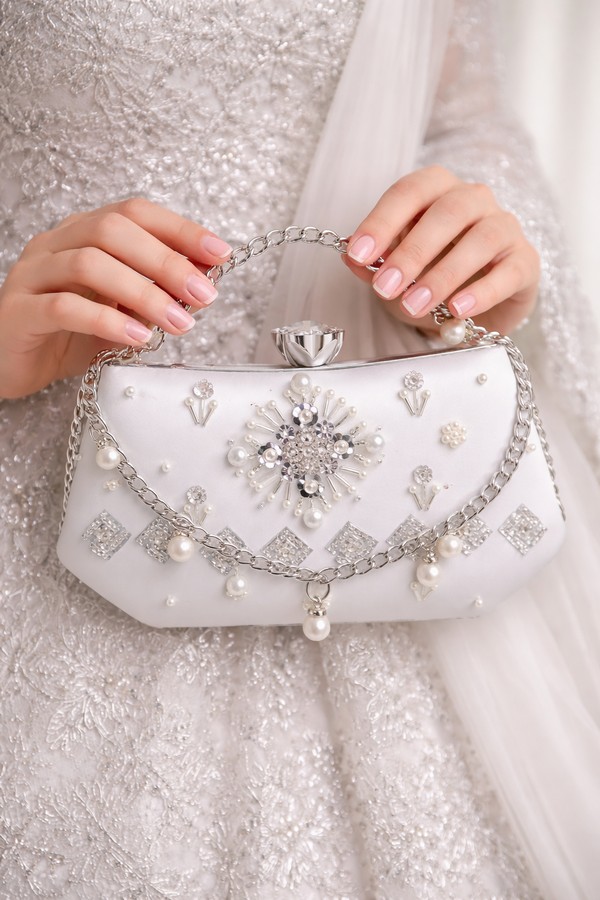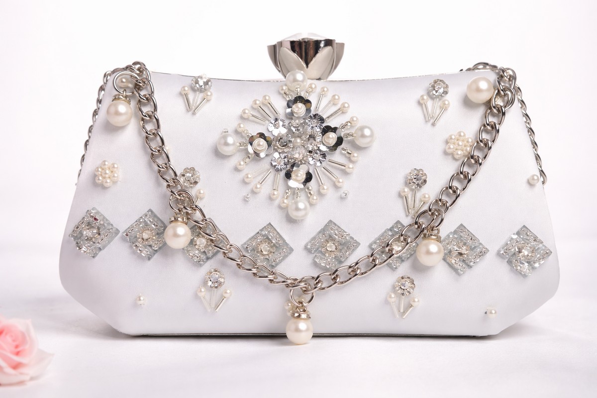Type of work : This white pearl clutch for women is hand embellished with pearls, crystals, and rhinestones on premium satin.