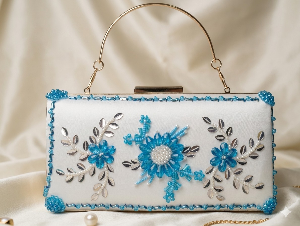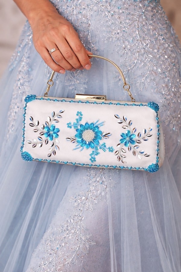 Type of work : This white fancy clutch for women is hand-embellished and hand-embroidered with crystal stones, pearls, and blue floral embellishments on premium satin.